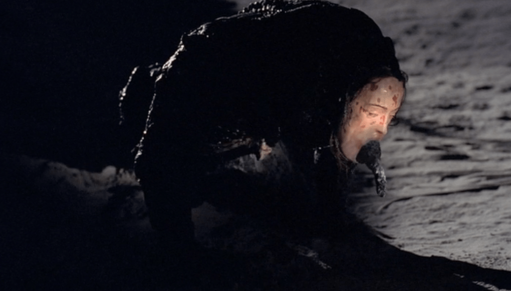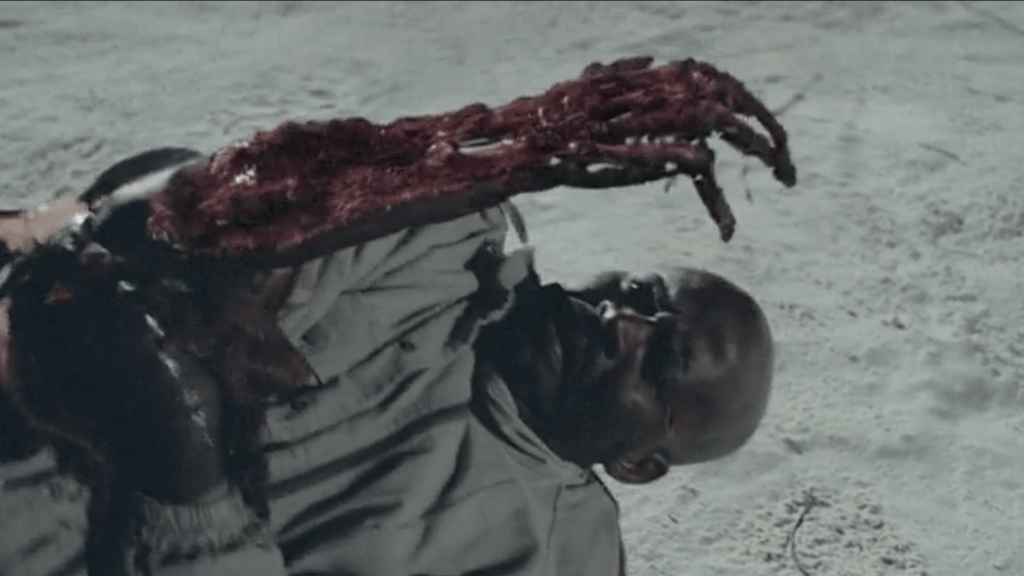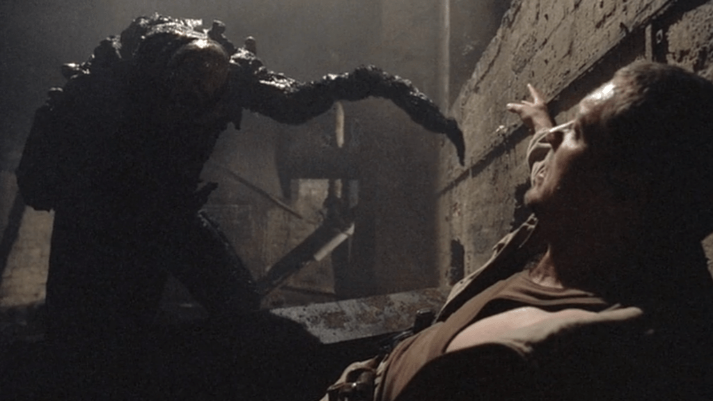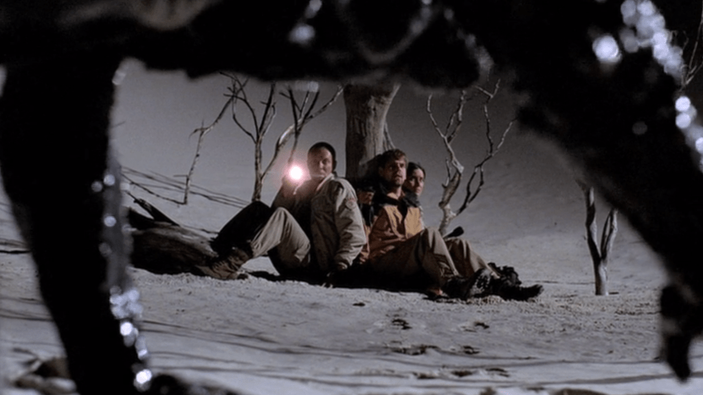 The film remains watchable mainly because of the creatures, which look pretty good: a mix of flowing black particles and pieces of skeletons or body parts (such as a victim’s face, or a fleshless skull, etc). If a creature gets shot it simply reverts back to a mass of particles and seeps back into the desert, leaving the gnawed bones behind that it had been using as its own temporary skeleton. These creatures really should have had more screen time. Shame.