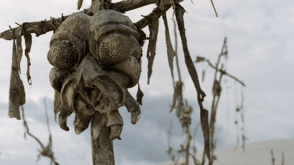 I feel the origin of these particle-things would have worked better if it had been some kind of African supernatural force, which was hinted at when the characters encounter a bunch of strange, bug-eyed totems in the desert. The final revelation that the black swarm is controlled by a small, orange blob-sack hive-mind (that can just be stabbed) comes across as rather underwhelming.