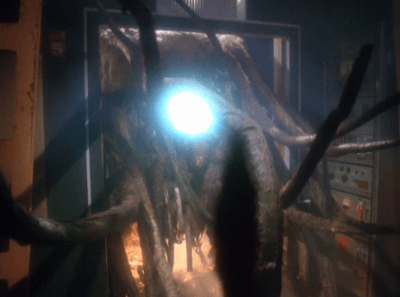 The standout moment is the flashback sequence where the Ultra Probe crew is attacked and killed by the creature. The tentacled, Lovecraftian monster materialises after swirling lights, noise and wind enters the Probe’s airlock. The screaming thing’s single, glowing eye mesmerises its victims, compelling them to willingly allow the writhing tentacles to grab them. They are then pulled into the slot-like orifice/mouth of the creature, which immediately digests them and their desiccated corpses are unceremoniously spat out onto the floor!