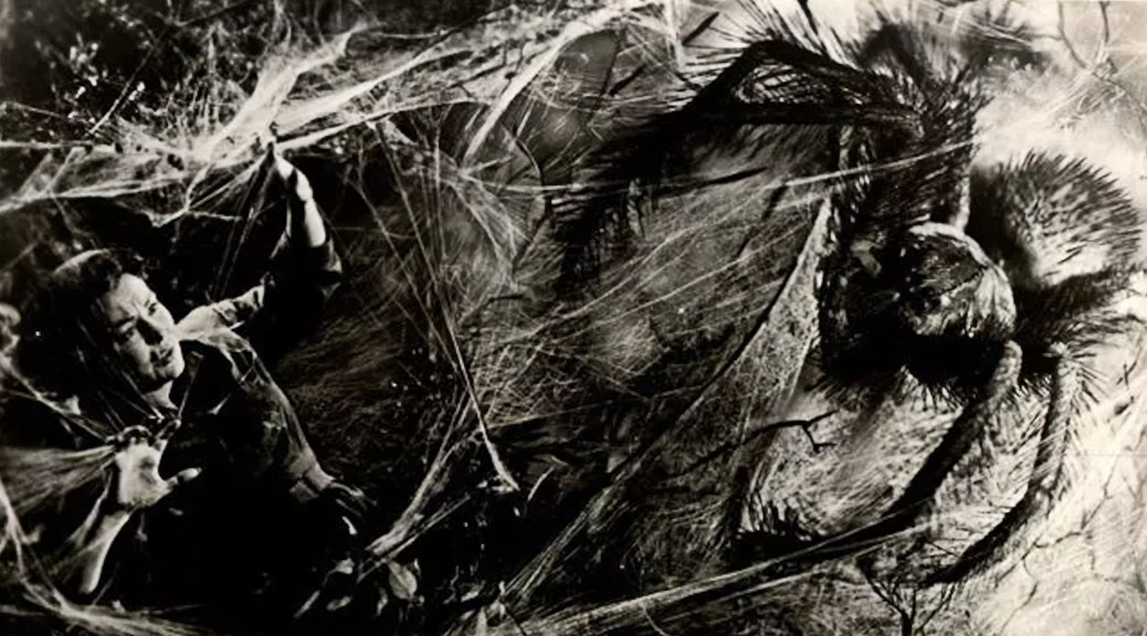 The best moment comes when a huge spider fights with a giant cockroach, as the heroine, trapped in the spider’s web, looks on in fear. This sequence is achieved using rear projection, and it looks pretty cool, with tree branches and white strands of prop spider web strung over the rear projection screen, adding a sense of depth and dimension to the visuals. But, when Gil runs up to save Michele, the rear projection image (of the spider) is turned off for some reason, so that the blank rear projection screen can be clearly seen beneath the prop webbing. But, hey, it’s a memorable creature-tastic sequence all the same!