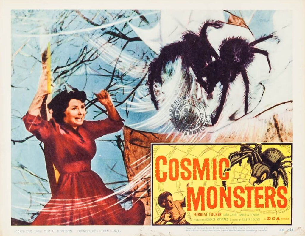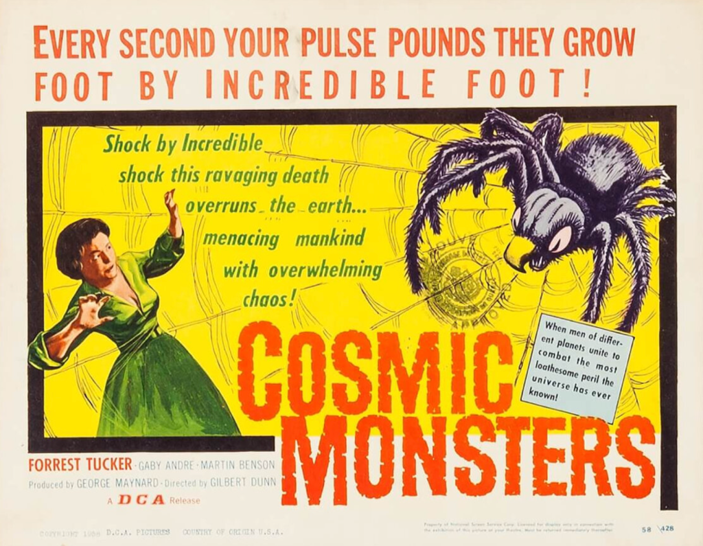 Also known as COSMIC MONSTERS and THE STRANGE WORLD, this b&w British science fiction horror movie tells the story of experiments with magnetism that unleash cosmic rays that turn a hobo into a burnt-faced strangler and enlarges all the local bugs.