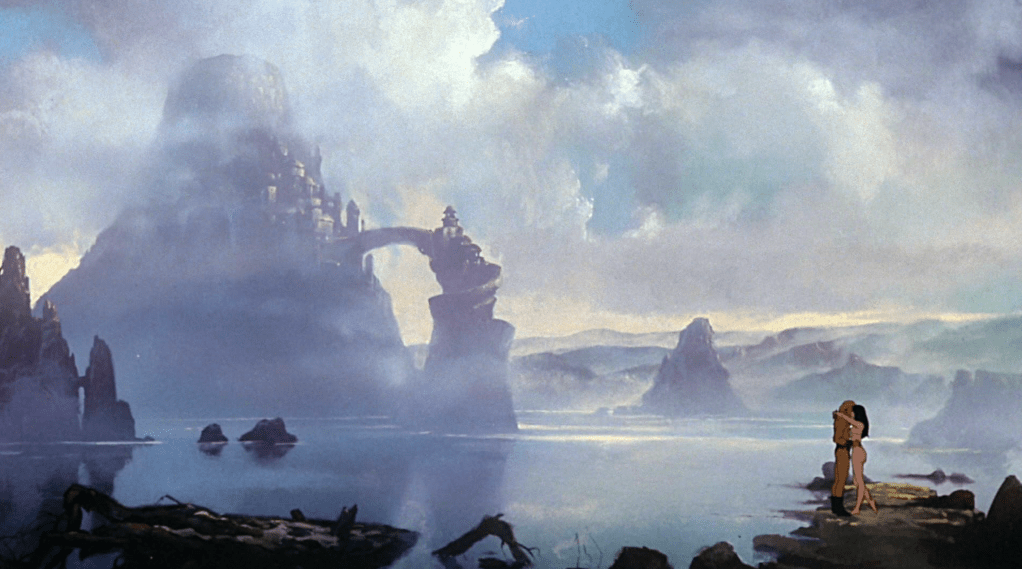 The mix of rotoscoped characters and painted background scenes (painted by Thomas Kinkade and James Gurney) lacks the finesse of Disney, but the style does capture the feel of Marvel’s Conan comics (which were written by Roy Thomas) and the action is more violent than anything seen in a Disney movie.