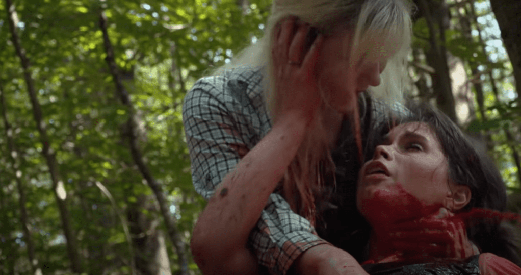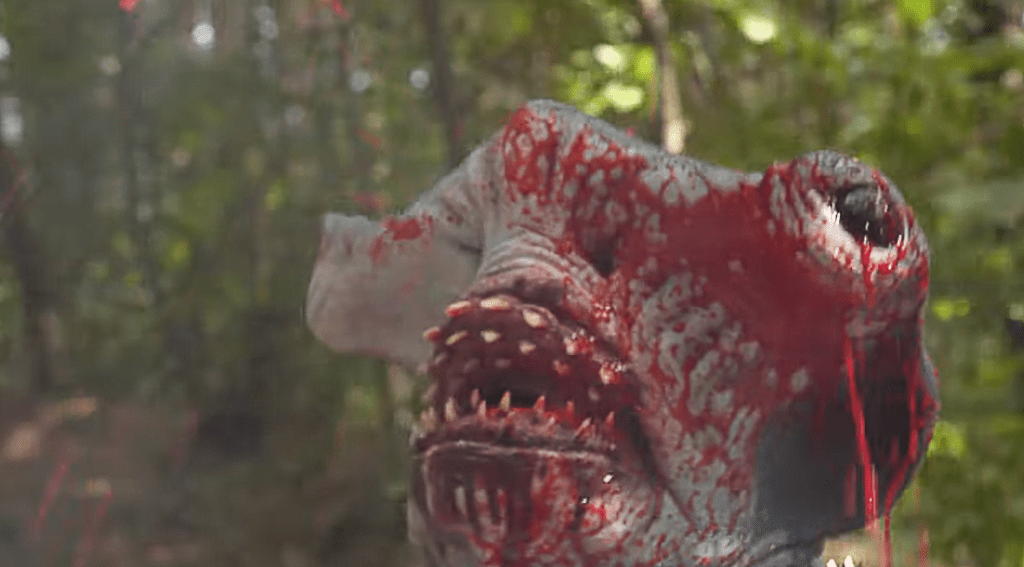 Many of the monster attacks are shot in a very similar fashion, with the suitmation actor (Brandon Wheeler) shoving the costume’s shark head against the current victim’s neck, as blood is pumped everywhere. Though the results are samey, they are bloody, and there’s the occasional disembowelment of a victim added to the mix too.