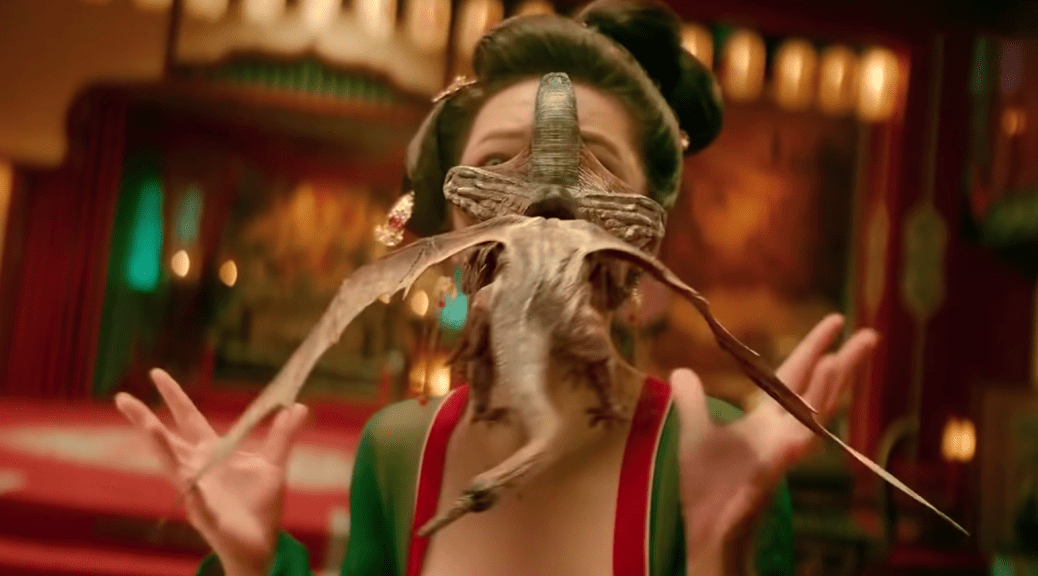 A detachment of golden-armoured royal warriors eventually arrive in the nick of time, dispensing stuff that, somehow, wards off the creatures. The humongous main monster, which has a bulky, blobby body held aloft by multiple tentacle-legs, retreats through the fog, away from the city. This movie, also known as CHANG’AN FOG MONSTER, is a contained monster-horror-fantasy yarn for the most part, set almost entirely inside the guesthouse, with the gigantic, spike-tentacled, mainly unseen boss beast treated both as a real threat and also as a kind of otherworldly symbol of the anger that has been inflamed by the perceived injustices perpetrated by those in power.