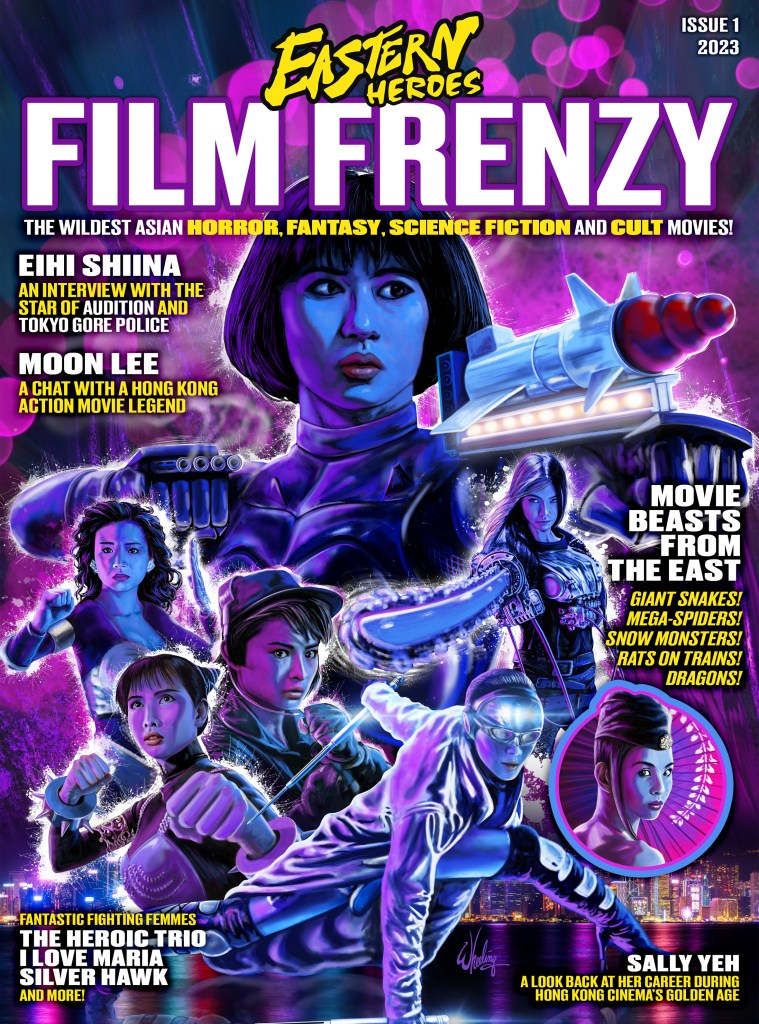 The first issue features a truly mouth-watering cover painting by Darren Wheeling, an interview with Eihi Shiina, the star of TOKYO GORE POLICE, HELLDRIVER and AUDITION, plus a chat with Hong Kong action star Moon Lee! There’s a gallery of film posters from Taiwan, Hong Kong and Indonesia, a look at hopping vampire movies, a chat with the director of Thai horror-chiller GHOST OF MAE NAK, a dive into the world of Asian fighting-femmes sci-fi-action flicks like THE HEROIC TRIO, plus much more!