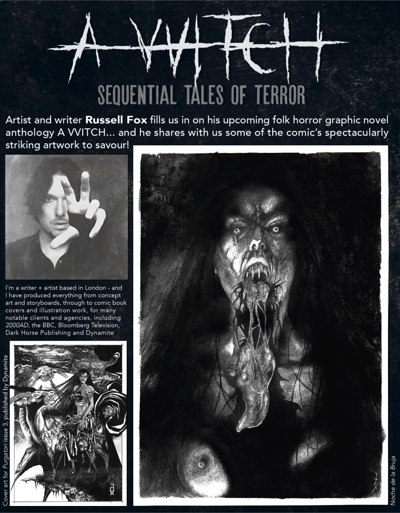 And there’s lots of other great stuff in the magazine too, including a look at the upcoming folk horror graphic novel A VVITCH. Some of artist/writer Russell Fox’s truly awesome illustration work for this exquisite-looking anthology book is displayed for your pleasure!