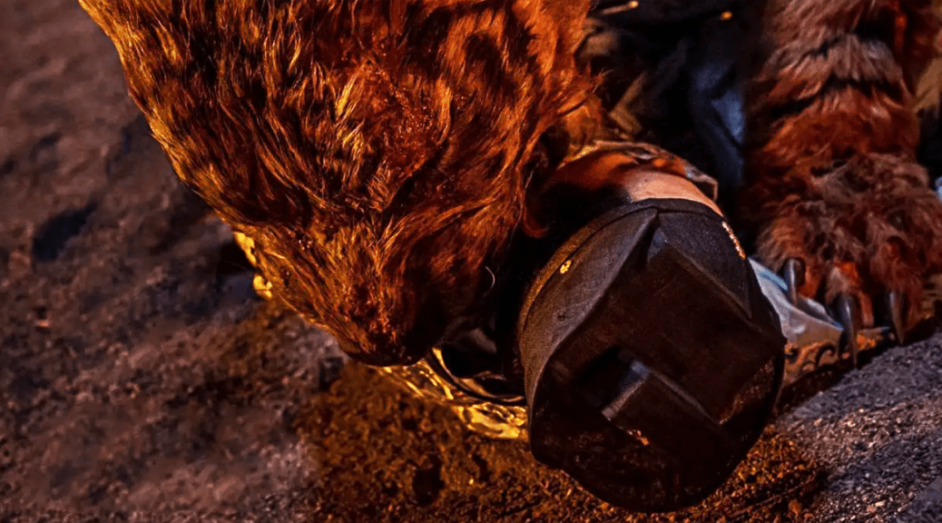 Song Wu manages to save a village child, but can’t find Jingwen, so, after an overly-melodramatic crying scene triggered by the death of Song Wu’s mate Bao, Song Wu prepares to go on a second mission back into the cave to retrieve Jingwen. As Song Wu smudges camo paint on his face, he muses that the giant wolves, which have become intelligent, must have decided to take Jingwen as a hostage so that they could draw all the humans to the cave-den to be killed. Song Wu marches stoically towards the cave, with his face no longer covered in camo makeup (?!), following a trail of bracelet beads left by his daughter. He moves deeper into the cavern to extract Jingwen, but knows he has only so much time before explosives are detonated to destroy the den. Father and daughter reunite and they succeed in reaching the cave entrance, but here they must take on the humongous boss wolf. Hey, but don’t worry: Song Wu gets his hands on a batch of dynamite!