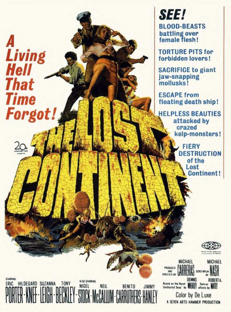 ‘Uncharted Seas’, the original Dennis Wheatley novel that THE LOST CONTINENT is based on, is nowhere near as enjoyably madcap as the movie adaptation: in the book the villains are descendants of slaves, whilst the movie boasts marooned conquistadors and their boy leader who, under the influence of his Spanish Inquisition mentor, feeds people who fail him to a rubbery Lovecraftian weed-monster in the hold of his stranded galleon!