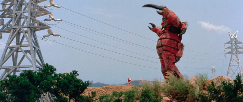 Another cool moment features a red bug-dude who rapidly enlarges, so Inframan (just like his Japanese Tokusatsu hero counterparts) grows in size too! This is all done using forced perspective, seen from a low angle, with some slo-mo shots, making this giant showdown an effectively-handled, standout scene in the film.