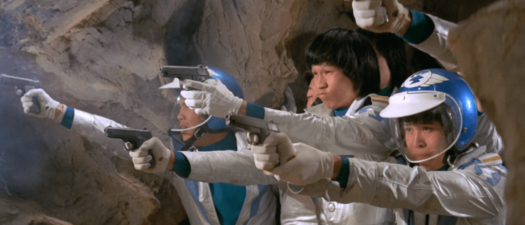 The plot may be inconsequential, but that doesn’t really matter, as THE SUPER INFRAMAN is non-stop fun from beginning to end. You get to see a mass fight between the silver-suited good guys and Princess Elzebub’s Skeleton Warrior minions in a studio set full of skull carvings and creature skeletons. When the Skeleton Warriors get shot they tend to explode!