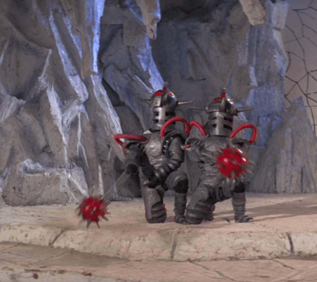 Then we get to witness a fight between Inframan and two mechanical monster-men, who can launch their extendable heads and propel spiked mace-hands at him on retractable metal springs!