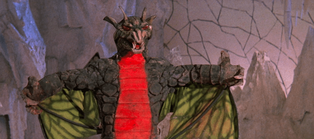 For fans of Japanese-style Tokusatsu action, this Chinese take on the genre, which is also known simply as INFRA-MAN, is an awesome addition, with the folks at Shaw Brothers really putting a lot of effort into this: you get kung fu fights galore with acrobatic flips, somersaults and loud punching sound effects, pyrotechnics, cell-animated laser beams, brainwashing, some iffy flying shots, lots of extras in costumes, a fiery lava pit, a glacial cave set, and a finale in which Elzebub turns into a winged monster that can regrow its head when Inframan cuts it off!