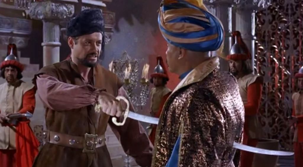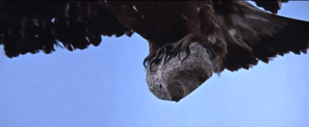 The fight between a giant scorpion and a giant hermit crab on a small, rocky isle is pretty cool. These arthropod beasts are brought to life via full-scale mechanical models that I think look okay: I like the scorpion’s rapidly moving legs when it zips towards the crab to battle it. Though the full-scale hermit crab monster is less than mobile as a whole, it’s facial movements are really impressive: when you get a close-up of its rapidly chattering, beaky face I think it looks pretty good.